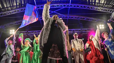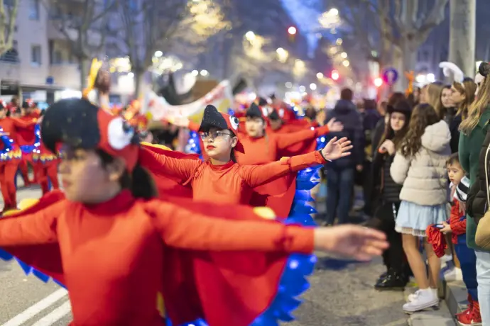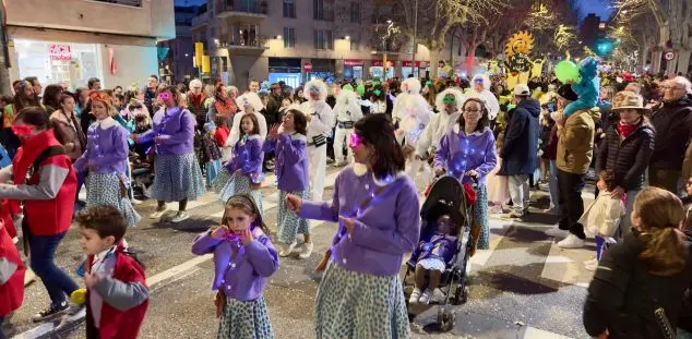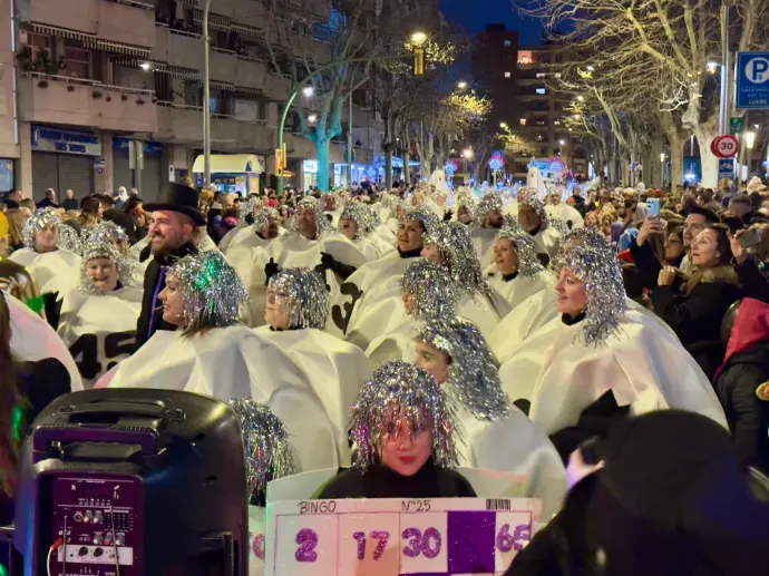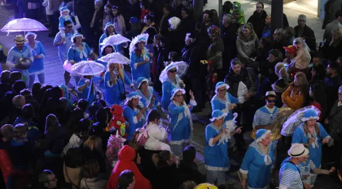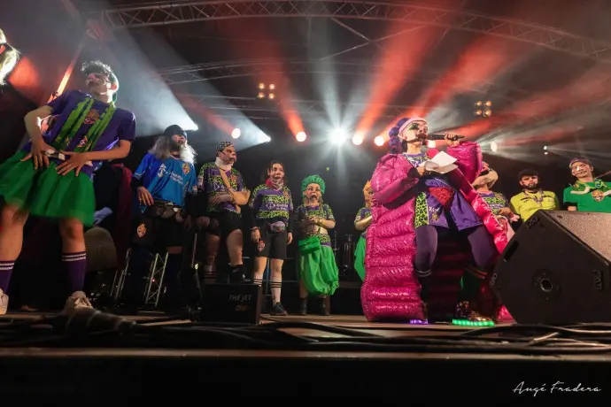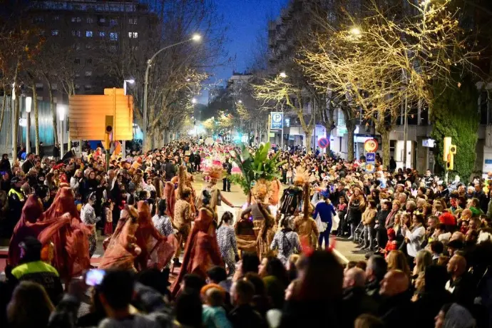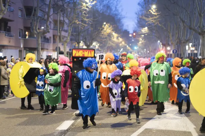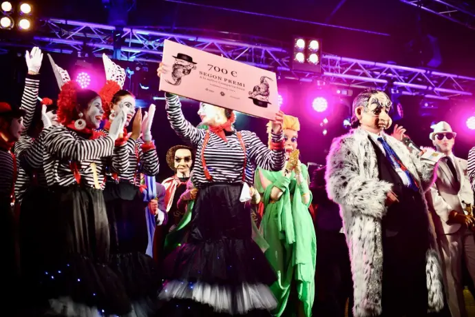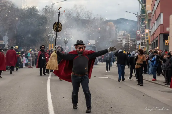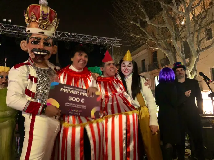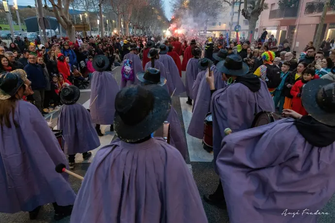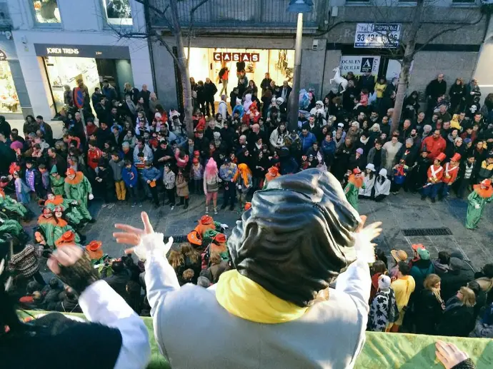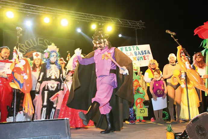 En Pellofa, rei del Carnestoltes, no pot fallar, evidentment, a l'acte més important del seu curt regnat. Acompanyat dels Botargues que, com sempre, l'escorten i sobre la seva carrossa, saluda a tots els seus súbdits i també observa de ben a prop les comparses.