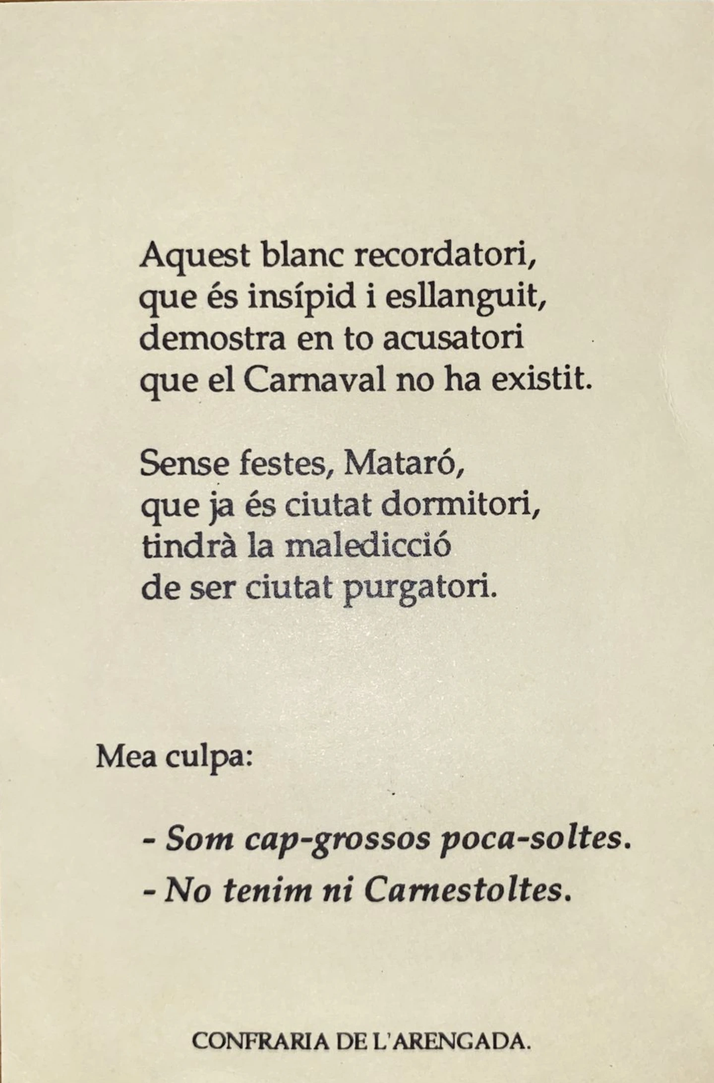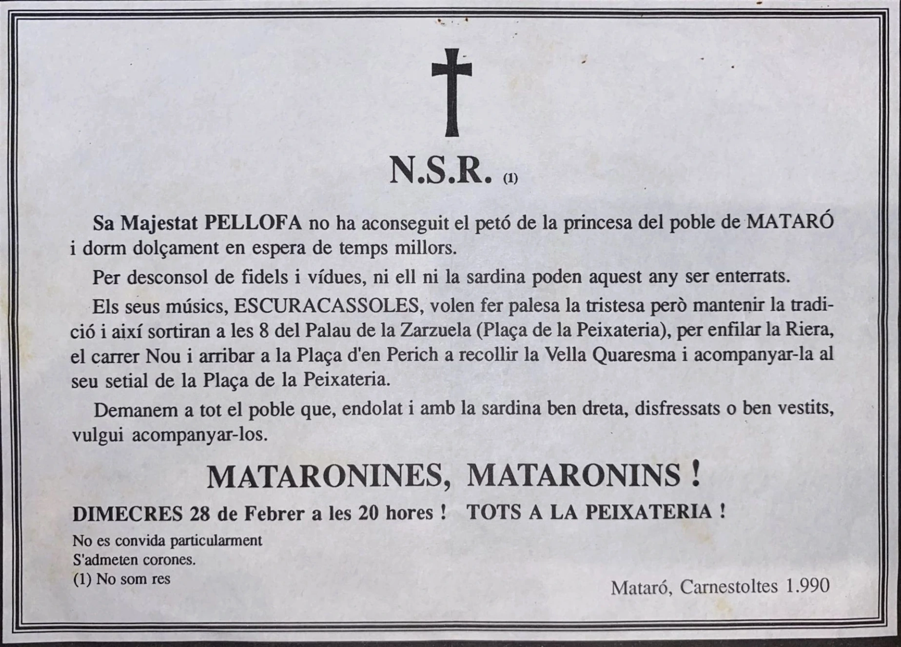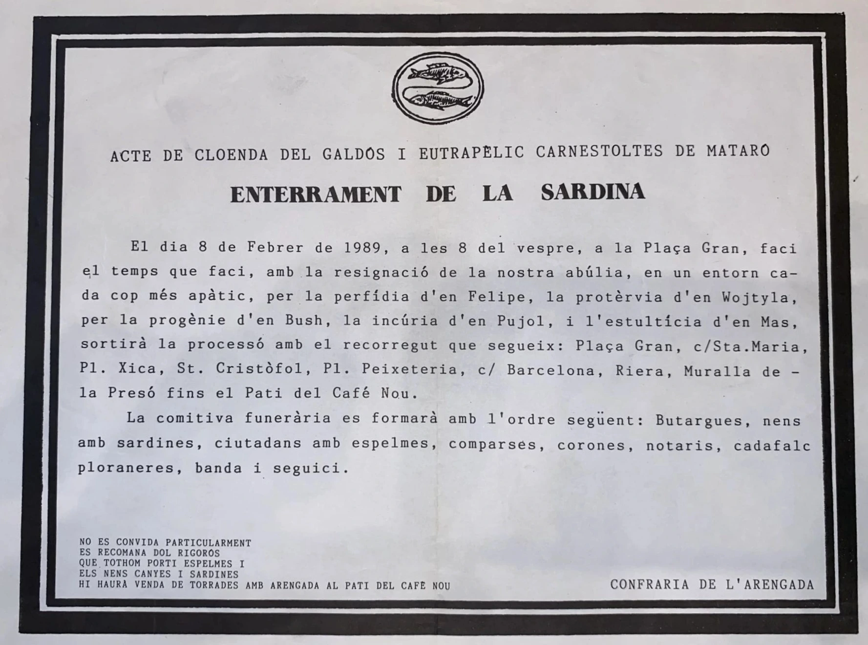 L'acte de l'enterrament també va patir alguns canvis, ja que no hi havia el personatge a qui enterrar. L'any 1989 es va enterrar a una Sardina enorme, però l'any següent, el 1990, l'enterrament va ser només una cercavila dels Escuracassoles per acompanyar la Vella a l'entronització. La típica tornada del recordatori va ser substituïda per "Pobres cap-grossos poca-soltes, no tenim ni carnestoltes".