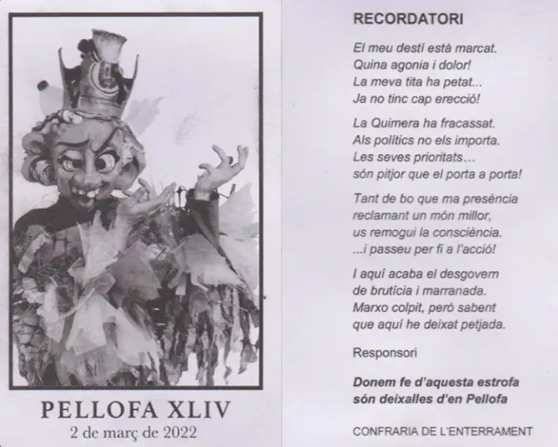 Pellofa XLIV representava tot el cúmul de brosses que l'ésser humà aboca al planeta. Tot ell era un cúmul d'elements químics i radioactius, a més d'aplegar compreses, iogurts, actimels, fregalls i tot mena d'altres deixalles. A ritme de "Decadencia" de Ska-p, va aparèixer i fer el pregó darrere l'Ajuntament. Aquell any, va ser la primera festa que es recuperava al carrer després de la pandèmia de la covid-19, adaptant tots els actes a les mesures de seguretat corresponents.